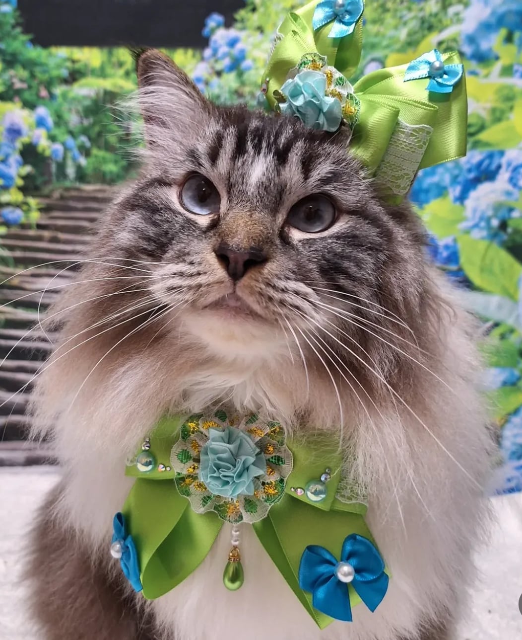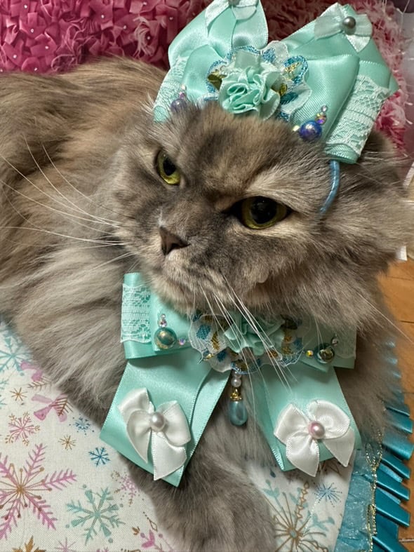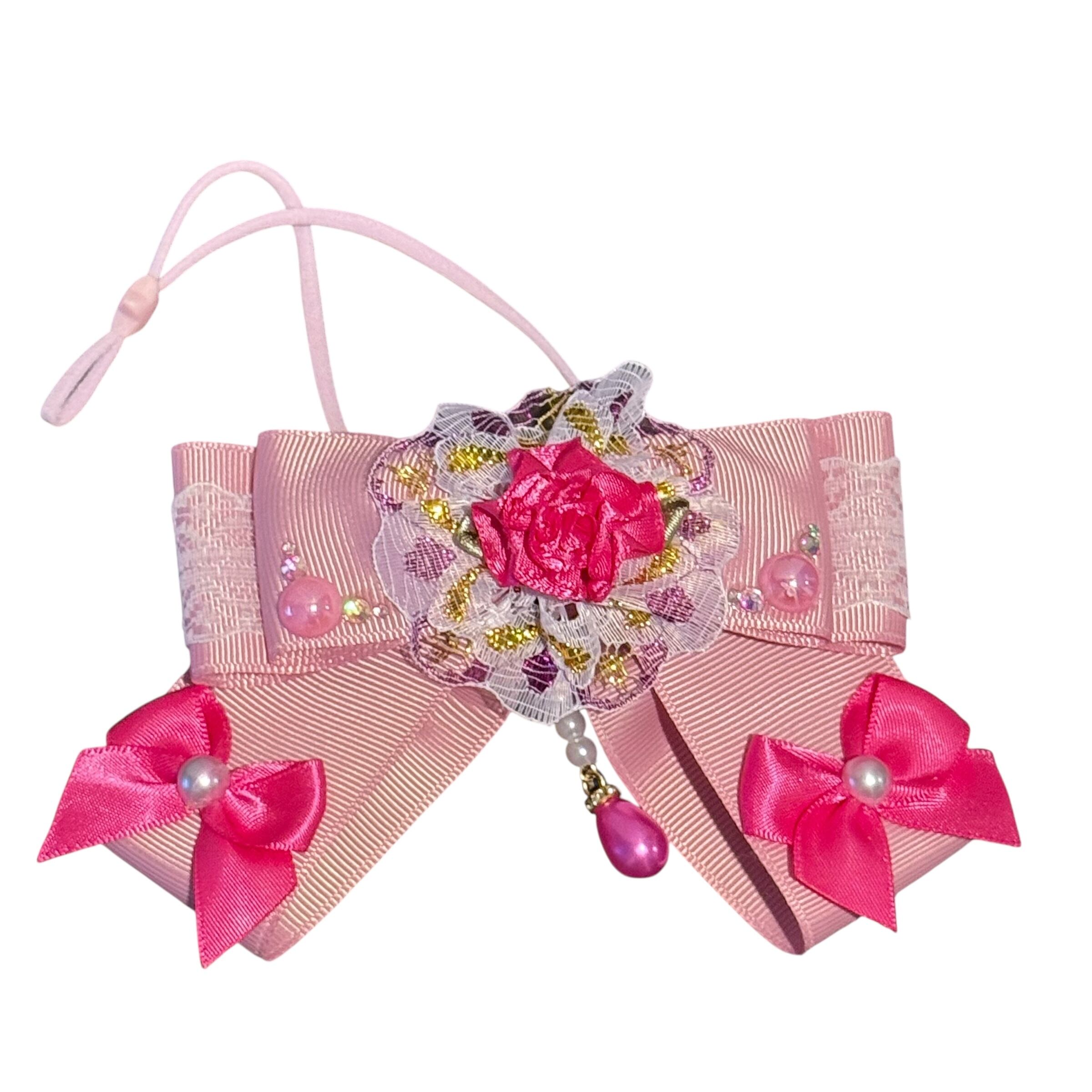 全てリボンで作っていて、ゴワゴワした造花は一切使っていないので、柔らかくて型崩れもしにくく、首周りのゴム部分は、人間のマスク用ゴムを使用しているので、優しい付け心地で、猫ちゃん、わんちゃんのストレスになりません。